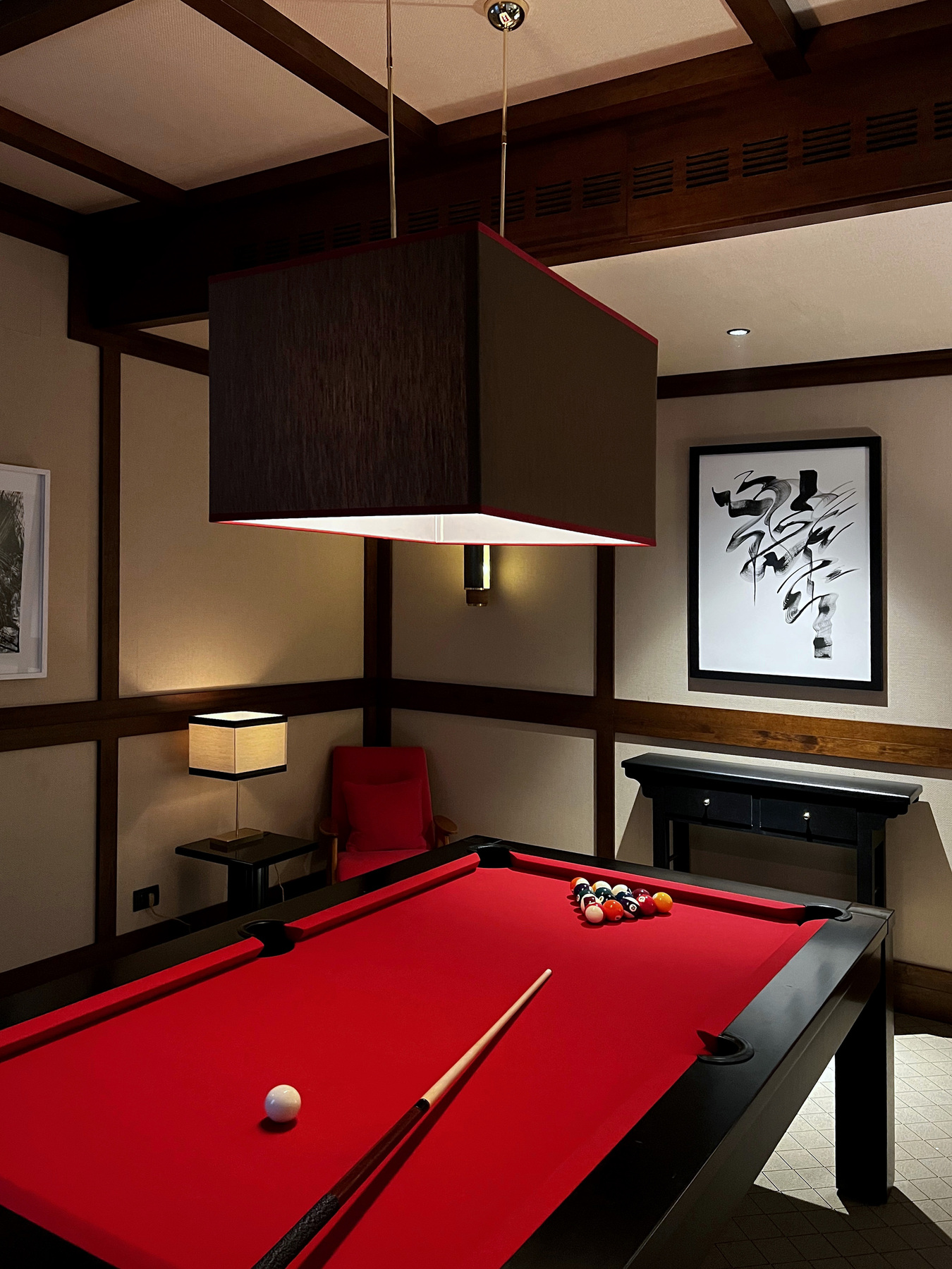 from the traditional Japanese design. Curated by the designer Marsica Fossati, this large, intimate and private environment is consisting of a “box” with oriental geometries inside which vintage furnishings with a vaguely English classic taste stand out. It represents a space in which to feel “at home but far from home”. Pool tables, fireplace, a small stage framed by heavy drapery, a series of poker tables, wallpapers with an oriental flavors all around, silky floreal fabrics and soft lights that warm the atmosphere, make Arcade an elegant and refined environment.